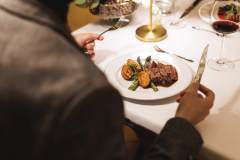 Plat principal: Steak de roast-beef avec sauce au poivre, asperges grillées et pommes de terre
